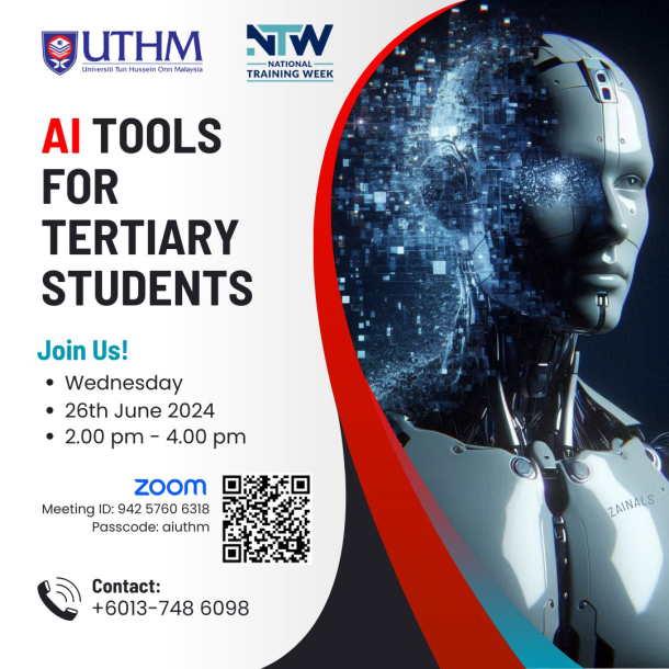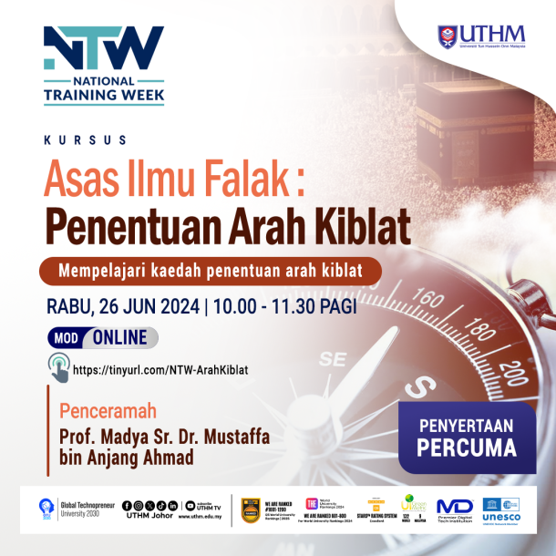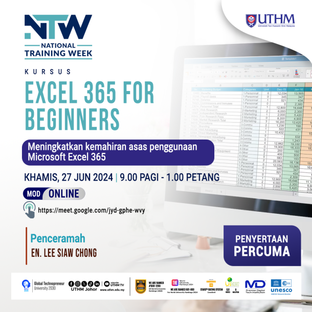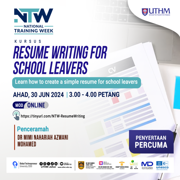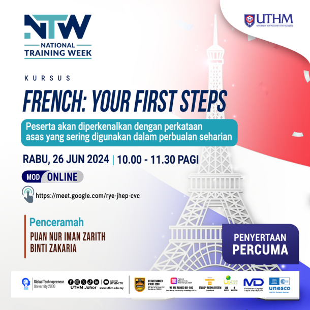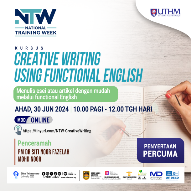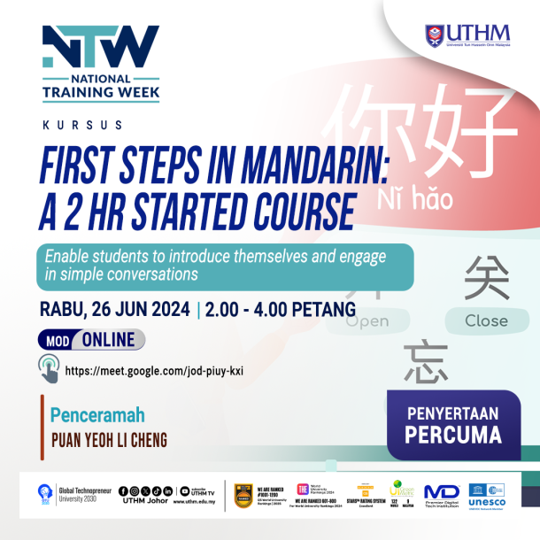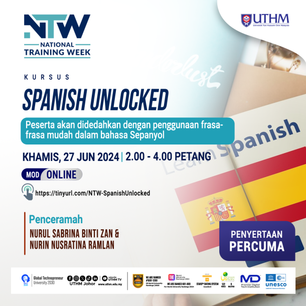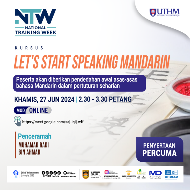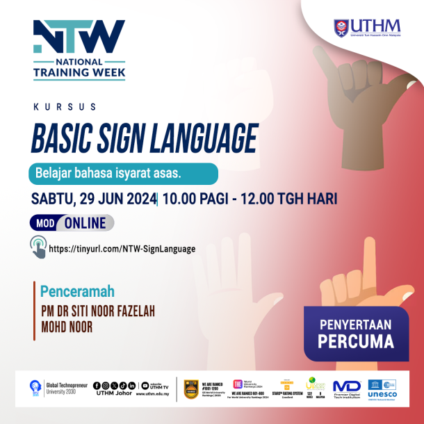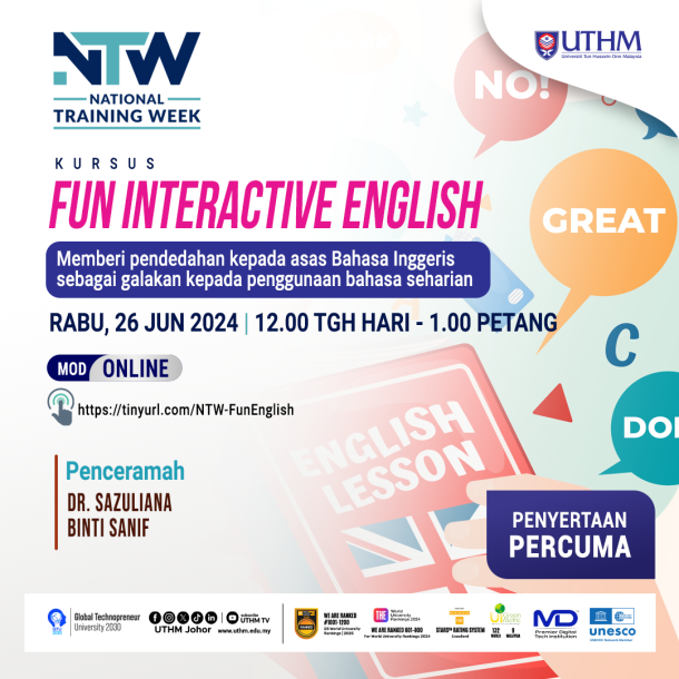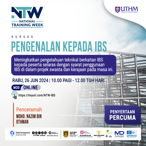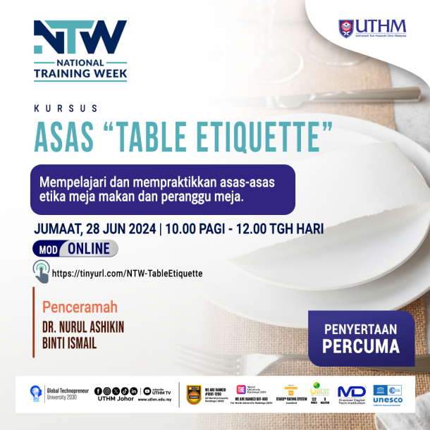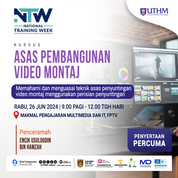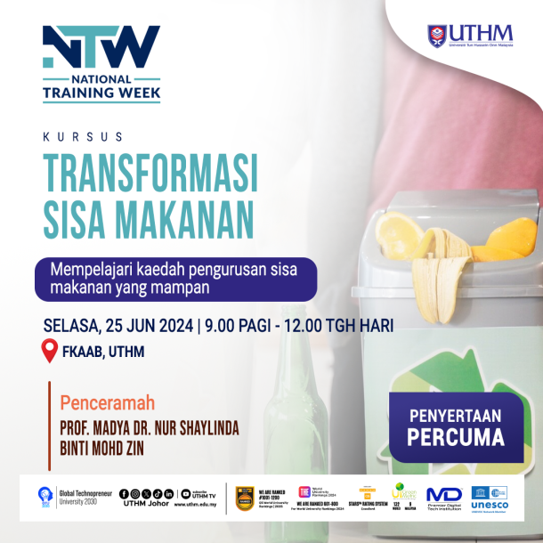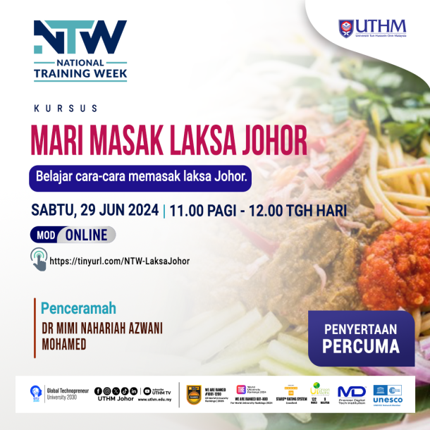 Universiti Tun Hussein Onn Malaysia (UTHM) menzahirkan rasa bangga dapat bekerjasama dengan National Training Week 2024 (NTW 2024) dalam penawaran 29 jenis KURSUS/LATIHAN JANGKA PENDEK SECARA PERCUMA pelbagai kategori bermula 24 hingga 30 Jun 2024 (7 hari). Program NTW 2024 ini merupakan minggu latihan peringkat kebangsaan di seluruh negara yang menghimpunkan organisasi serta penglibatan individu warga bekerja untuk mengikuti program Pembelajaran Sepanjang Hayat (PSH). Sempena NTW 2024 ini, UTHM bakal menampilkan kursus/latihan merentasi pelbagai topik dan bidang kemahiran demi membantu meningkatkan pembangunan kerjaya sedia ada. Menariknya, UTHM melalui penyelarasan Pusat Pembelajaran Berterusan dan APEL (PPBA) dengan Human Resource Development Corporation (HRD Corp) akan menawarkan pelbagai kursus yang menepati sasaran industri TVET.